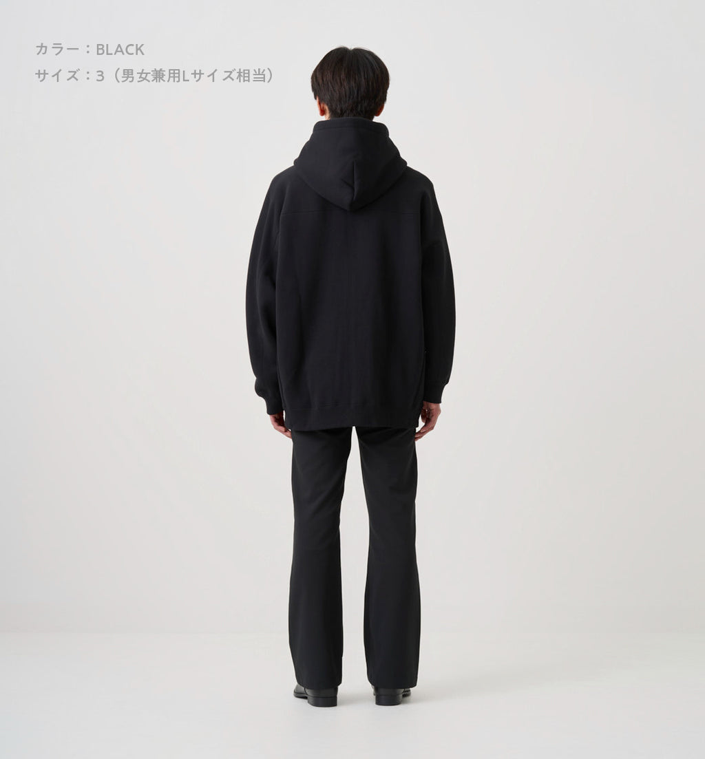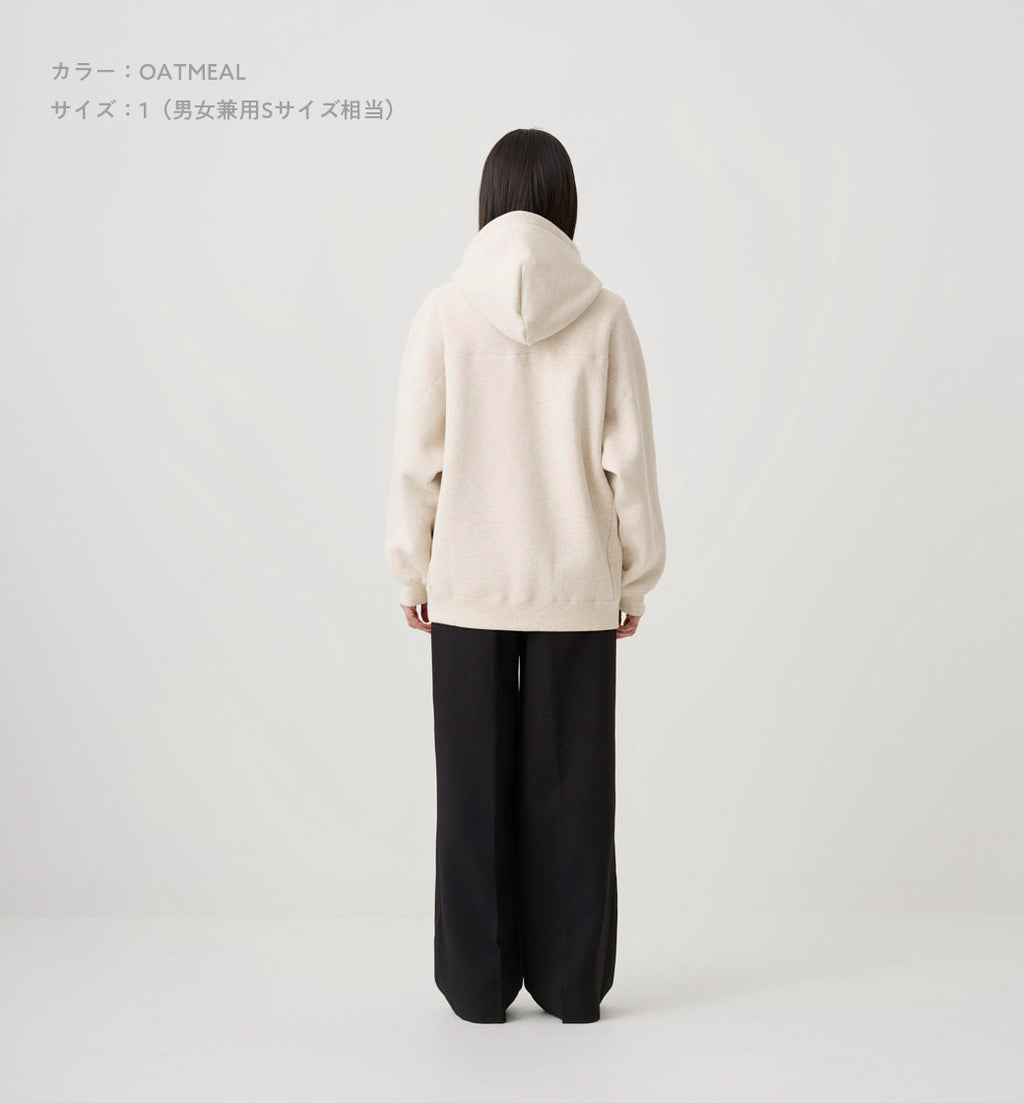 身丈62cm(着丈58cm)、肩幅56cm、身幅62cm、裾幅46cm、天幅23.2cm、前下がり7.5cm、後下がり3.8cm、袖丈46cm、袖幅27cm、袖口幅9cm、アームホール26.2cm、袖リブ丈4.5cm、裾リブ丈5cm、フード巾27.3cm、フード丈36cm、フードCB53.8cm、ファスナー丈53.5cm、フードひも丈114cm