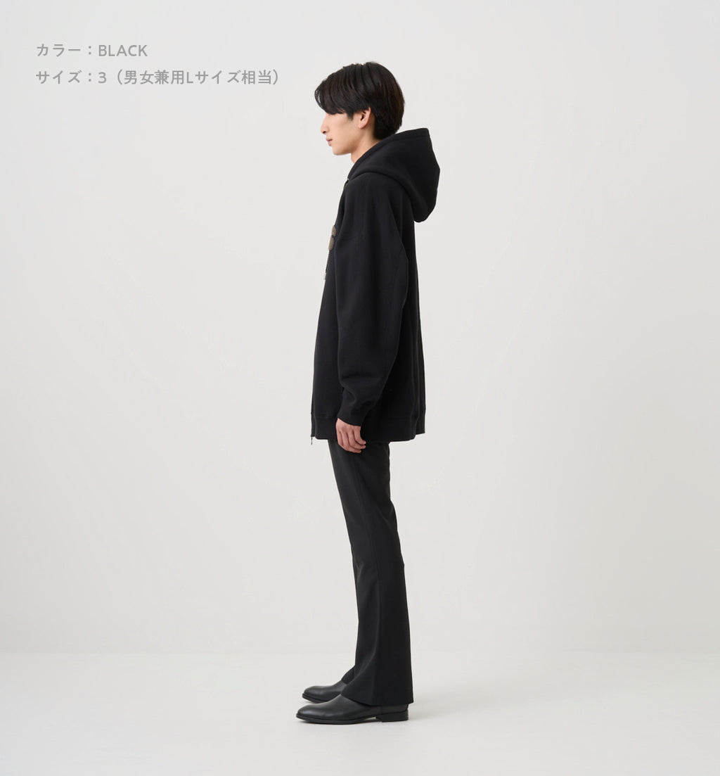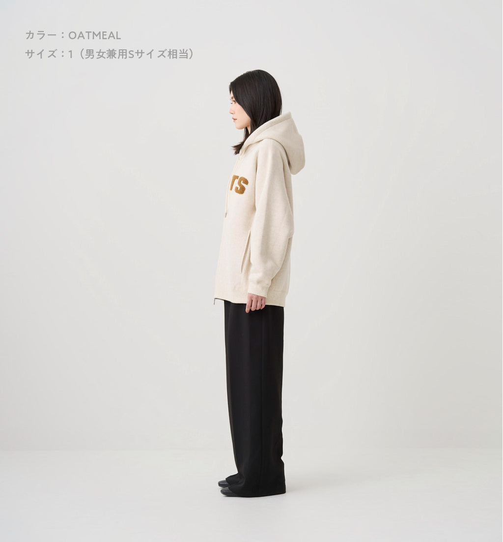身丈77cm(着丈73cm)、肩幅68cm、身幅74cm、裾幅55cm、天幅25cm、前下がり9cm、後下がり3.8cm、袖丈52cm、袖幅30cm、袖口幅10.5cm、アームホール29.2cm、袖リブ丈6cm、裾リブ丈6.5cm、フード巾30cm、フード丈39cm、フードCB58.8cm、ファスナー丈67cm、フードひも丈120cm